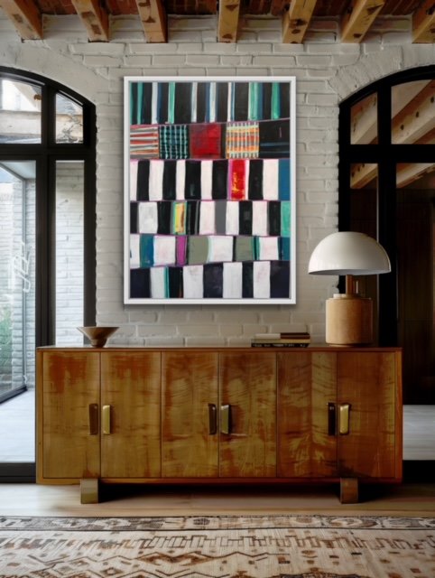 Black combines to electrify the blues, greens and whites. The addition of a touch of orange and red makes this both interesting and enjoyable work to enhance your home or workspace